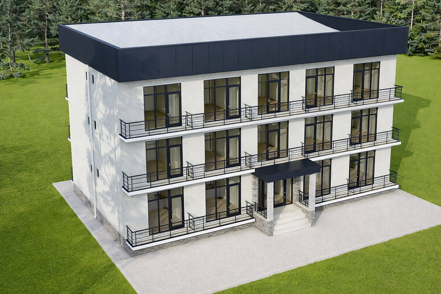 Трёхэтажный гостевой дом с цокольным этажом, расположенный в селе Бостери (участок Уч-Кара №2/15, Иссык-Кульский район). Проект разработан для комфортного размещения гостей и рационального использования пространства. Планировочное решение включает протяжённый коридор площадью 40,5 м² и несколько жилых блоков со спальнями и индивидуальными санузлами. Площади спален варьируются от 10,3 до 13,2 м², санузлы — от 2,6 до 2,7 м². Общая площадь одного из этажей составляет 169,3 м². Конструкция здания сочетает монолитный железобетон и энергоэффективные EMMEDUE панели, обеспечивая прочность, долговечность и высокий уровень теплосбережения.